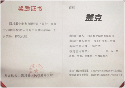 公司高度重视品牌战略,依法注册了“盖克”、“蜀中”、“三星堆”、“阿莫锋”、“益善源”、“蓉通”、“米兰体育”等108件注册商标,1999年“盖克”、2003年“蜀中”、2007年“三星堆”被认定为德阳市知名商标,2001年“盖克”、2004年“蜀中”被认定为四川省著名商标, 2008年“盖克”商标被国家工商行政管理总局认定为“中国驰名商标”。2017年3月,公司盖克牌、米兰体育牌阿莫西林胶囊和多酶片被四川省人民政府授予四川名牌产品称号。2016年,公司实现营业收入66373万元,利税7600万元;2017年,公司实现营业收入75045万元,利税7572万元。公司2017年被命名为德阳市第七批院士专家工作站,2016-2018连续三年被德阳市人民政府确定为重点龙头企业。